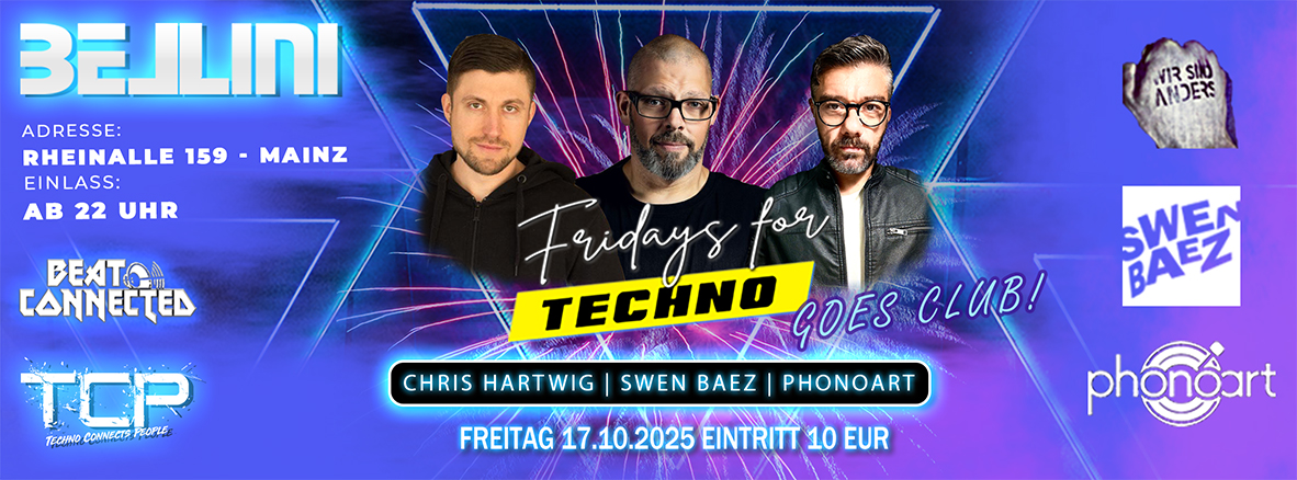 Am Freitag, den 17.10.2025, ist es endlich soweit: Das erfolgreiche Streamformat Fridays for Techno, das seit über 4 Jahren auf Techno Connects People (TCP) regelmäßig DJs und Fans weltweit verbindet, feiert seine Premiere im Bellini Club Mainz.